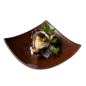 Poached oyster topped with champagne pearl mignonette and Oscietra caviar